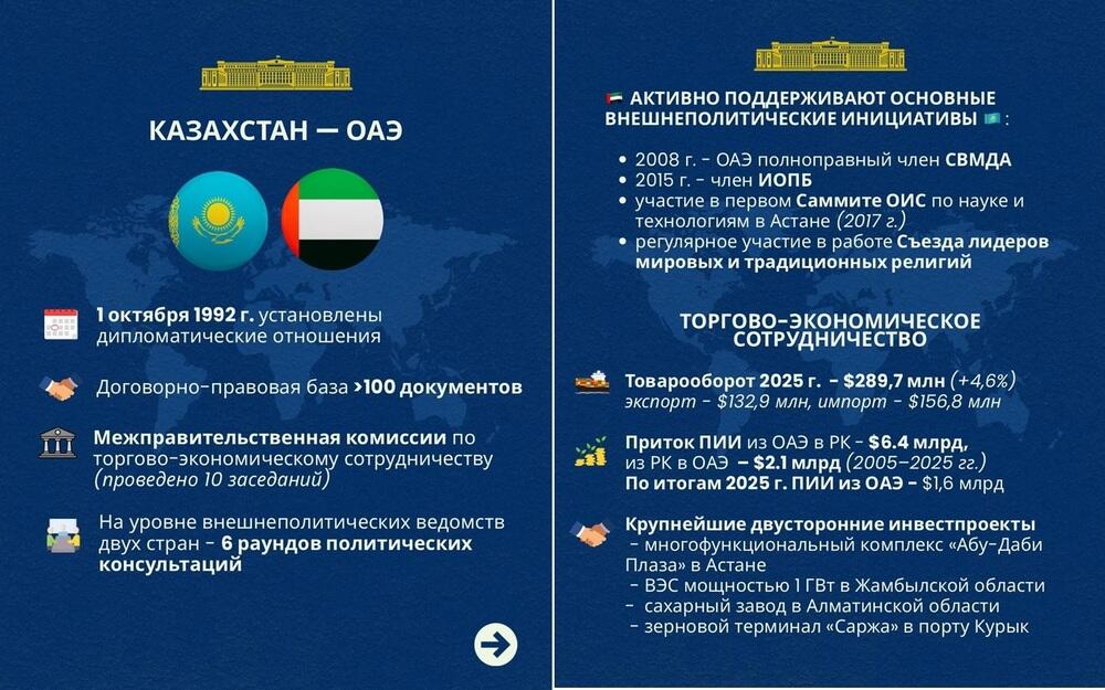 Экономическое сотрудничество всегда было прочной основой нашего партнерства. Сегодня ОАЭ являются одним из ключевых торговых и инвестиционных партнеров Казахстана в регионе, и мы заинтересованы в продвижении новых совместных проектов", - отметил глава МИД РК.