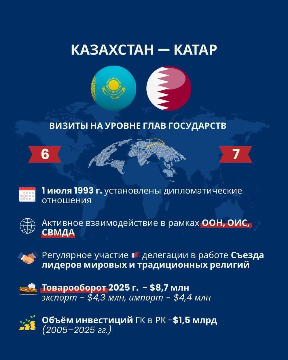 Что касается экономического взаимодействия, по итогам 2025 года товарооборот составил 8,7 млн долларов США, из которых экспорт Казахстана - 4,3 млн долларов, импорт - 4,4 млн долларов. За период с 2005 по 2025 годы объем инвестиций из Катара в экономику Казахстана достиг 1,5 млрд долларов США. Эти вложения направлены на развитие инфраструктуры, энергетики и других перспективных отраслей.