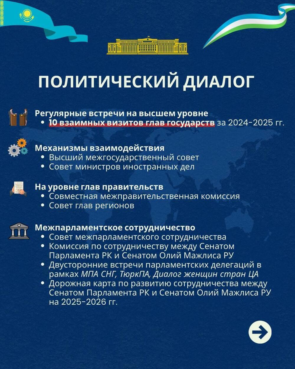 По данным ведомства, за 2024-2025 годы состоялось 10 взаимных визитов глав государств. Взаимодействие осуществляется через такие механизмы, как высший межгосударственный совет, совет министров иностранных дел, а также совместные межправительственные комиссии и советы глав регионов. Активно развивается и межпарламентское сотрудничество.