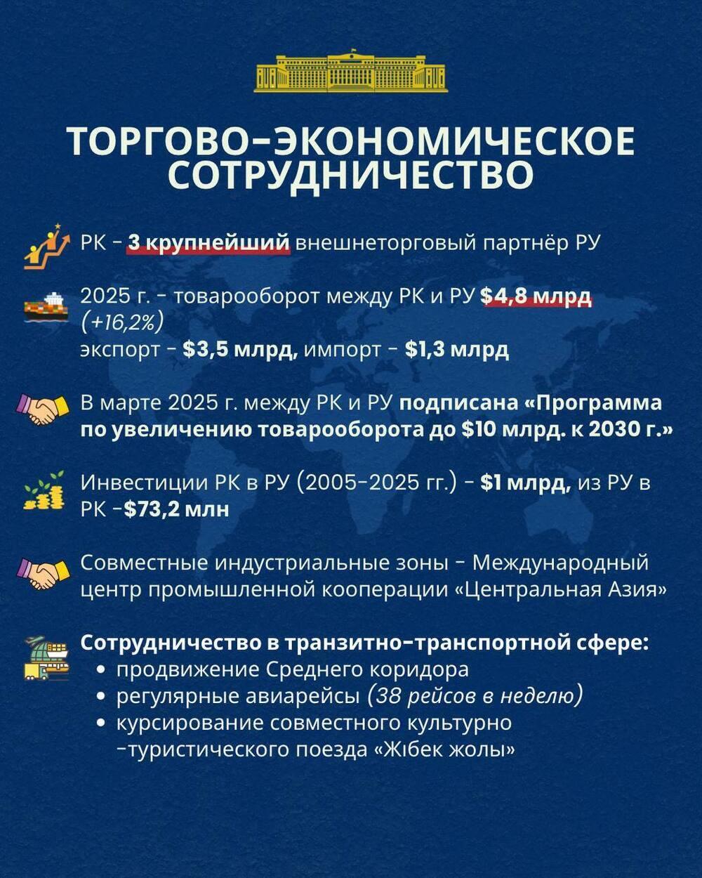Стороны также нацелены на дальнейшее наращивание взаимной торговли: в марте 2025 года подписана программа по увеличению товарооборота до 10 млрд долларов к 2030 году. Существенную роль играют инвестиции: за 2005-2025 годы вложения Казахстана в экономику Узбекистана составили около 1 млрд долларов, тогда как узбекские инвестиции в Казахстан достигли 73,2 млн долларов.