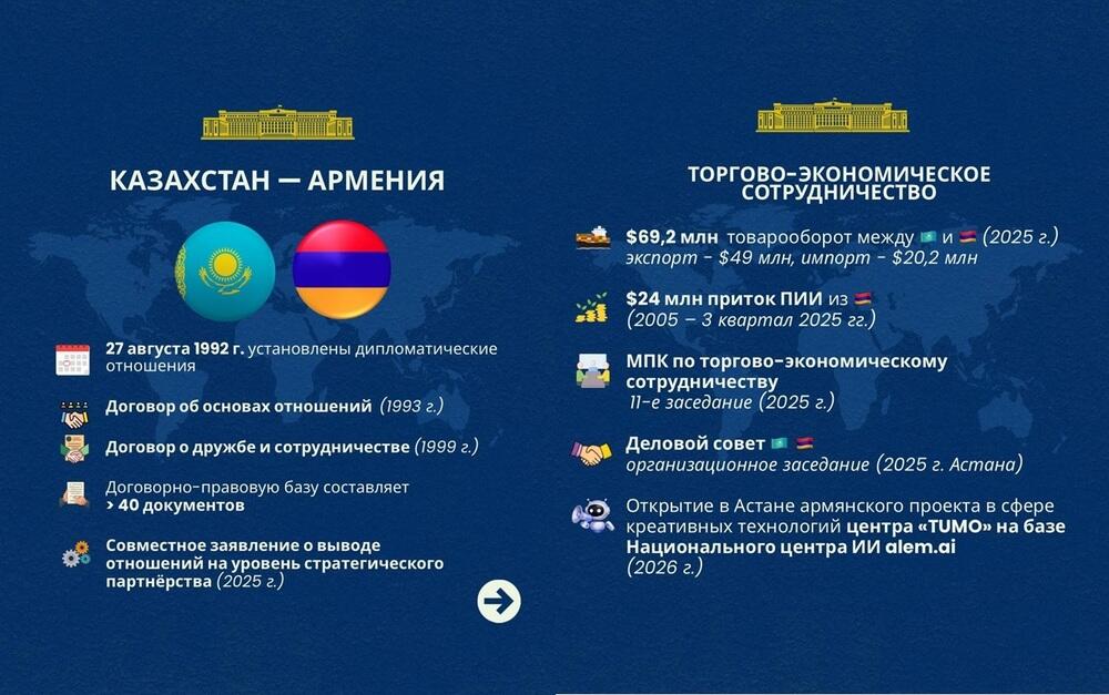 Товарооборот между Казахстаном и Арменией в 2025 году составил $69,2 млн. В том числе экспорт составил $49 млн, импорт - $20,2 млн.