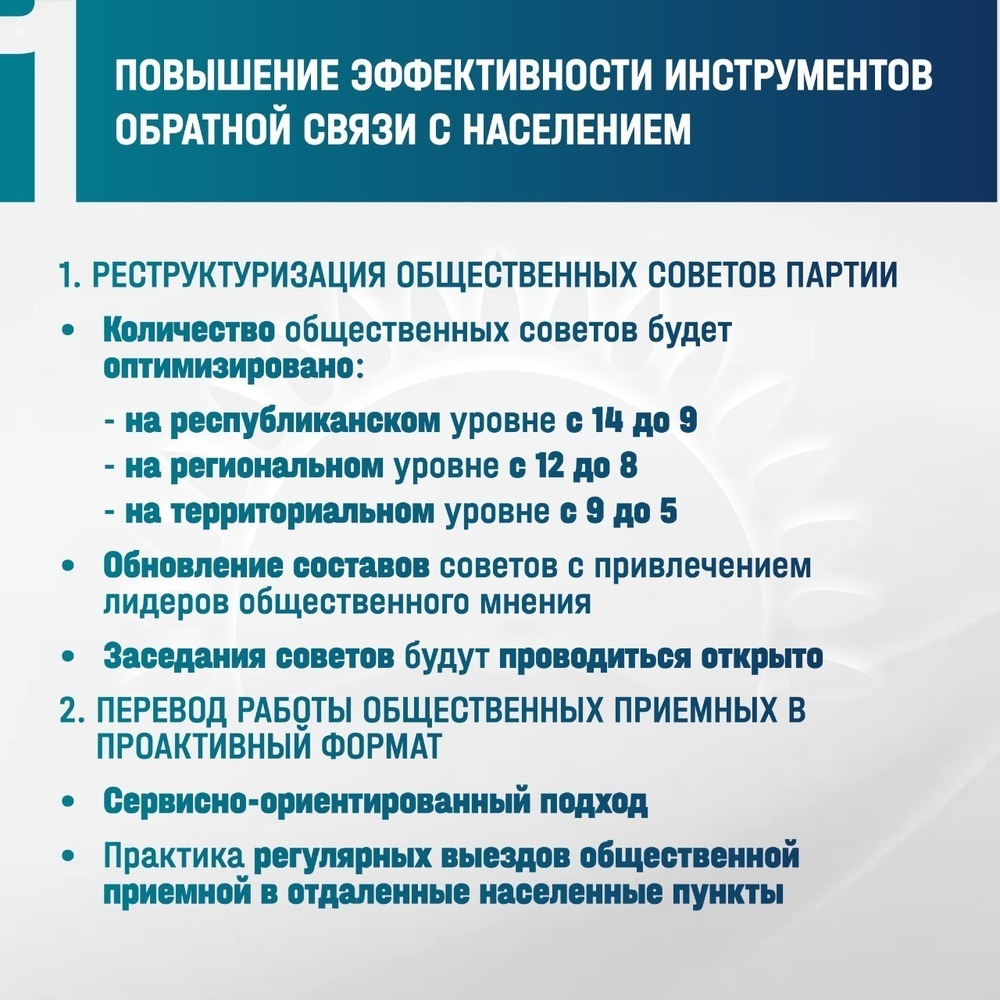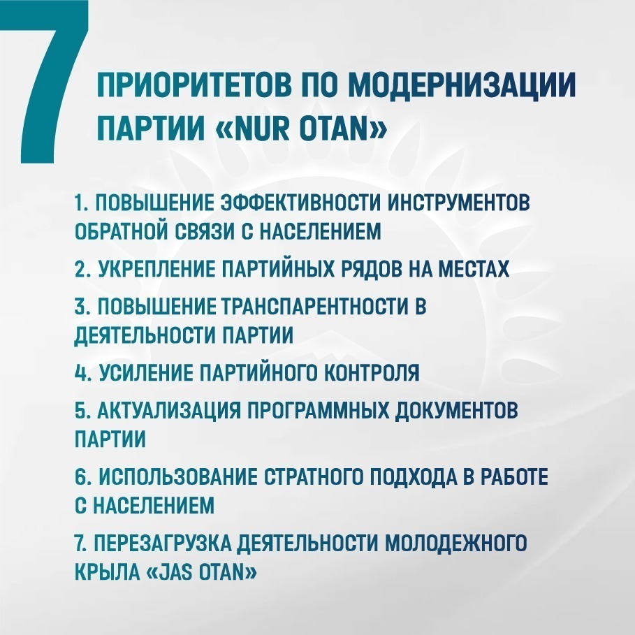 Бұл айтылған ұсыныстар - партияның модернизациясына арналған стратегияның негізгі бағыттары. Барлық өзгерістер партияның Ел үшін атқаратын қызметін одан әрі жетілдіруге бағытталған.