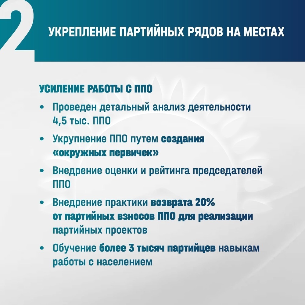 Первичные партийные организации - это основа партии. Сейчас их количество составляет свыше 4,5 тысяч. Планируется укрупнение ППО, создав "окружные первички". Предлагается внедрить оценку и рейтинг председателей ППО для повышения их активности, мобильности и ответственности. С целью поддержки инициатив первичек предлагается внедрить практику возврата 20% от партийных взносов в ППО для реализации партийных проектов на местах", - сказал он.