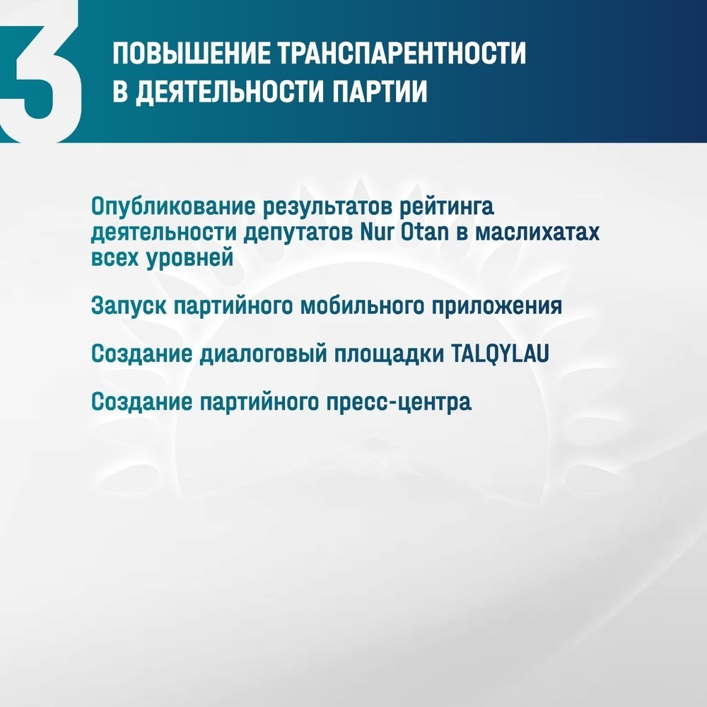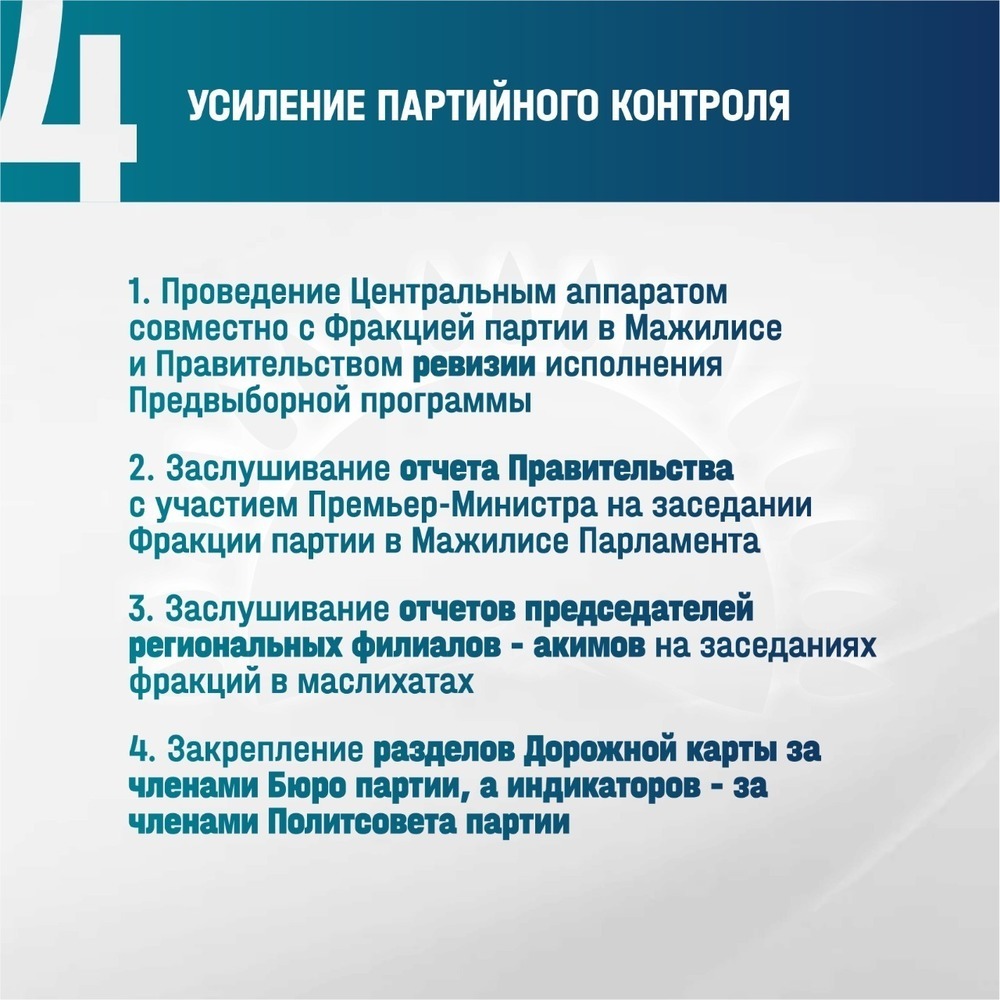 Ответственность остается одним из главных стратегических приоритетов партии. Особый акцент должен быть сделан на качественное и своевременное исполнение предвыборных обещаний. В апреле по итогам ревизии исполнения республиканской предвыборной программы предлагается провести расширенное заседание фракции в мажилисе, где будет заслушан отчет премьер-министра. Далее предлагаем провести аналогичную работу в регионах. Считаю необходимым ввести это в практику на системной основе", - сказал партиец.