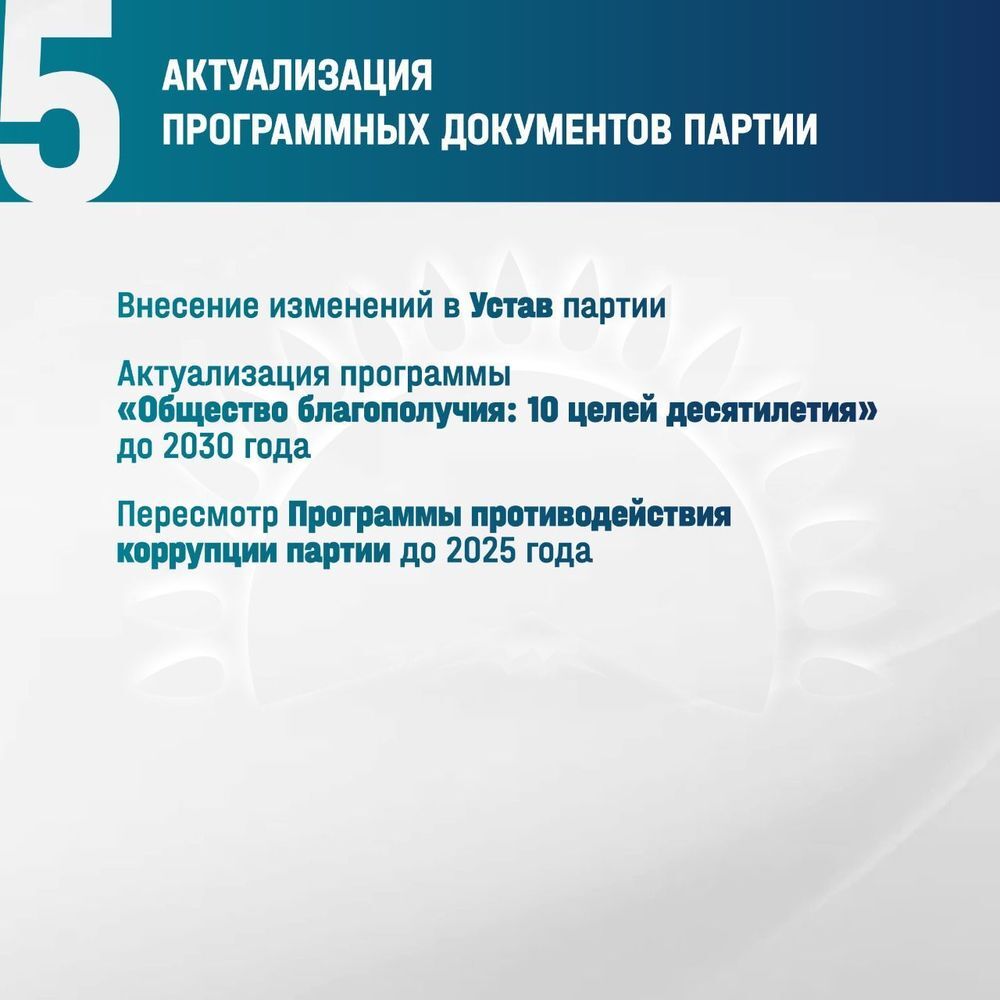 Партияның стратегиялық құжаттарына өзгерістер мен толықтырулар енгізу де өте маңызды. Қазіргі күні арнайы жұмыс тобы "Nur Otan" партиясының 2030 жылға дейінгі "Бақуатты қоғам: онжылдықтың 10 мақсаты" және 2025 жылға дейінгі Сыбайлас жемқорлыққа қарсы іс-қимыл бағдарламаларын қайта қарауға кірісті.