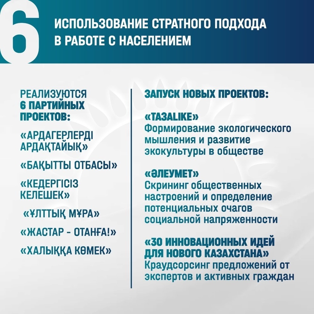 Сіздің тапсырмаңызды орындау мақсатында партия жұмысына кешенді талдау жасалды. Қоғамдық пікір мен сарапшылардың ұстанымы зерттелді. Аймақтардағы партияластардан ұсыныстар жиналды.