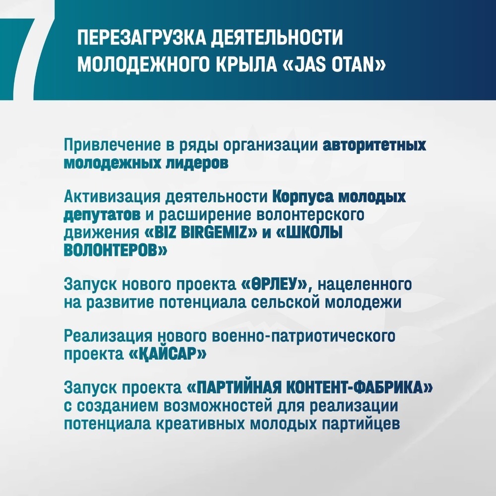 Жетінші. "Jas Otan" жастар қанатының жұмысын толықтай қайта жаңғырту аса маңызды.
