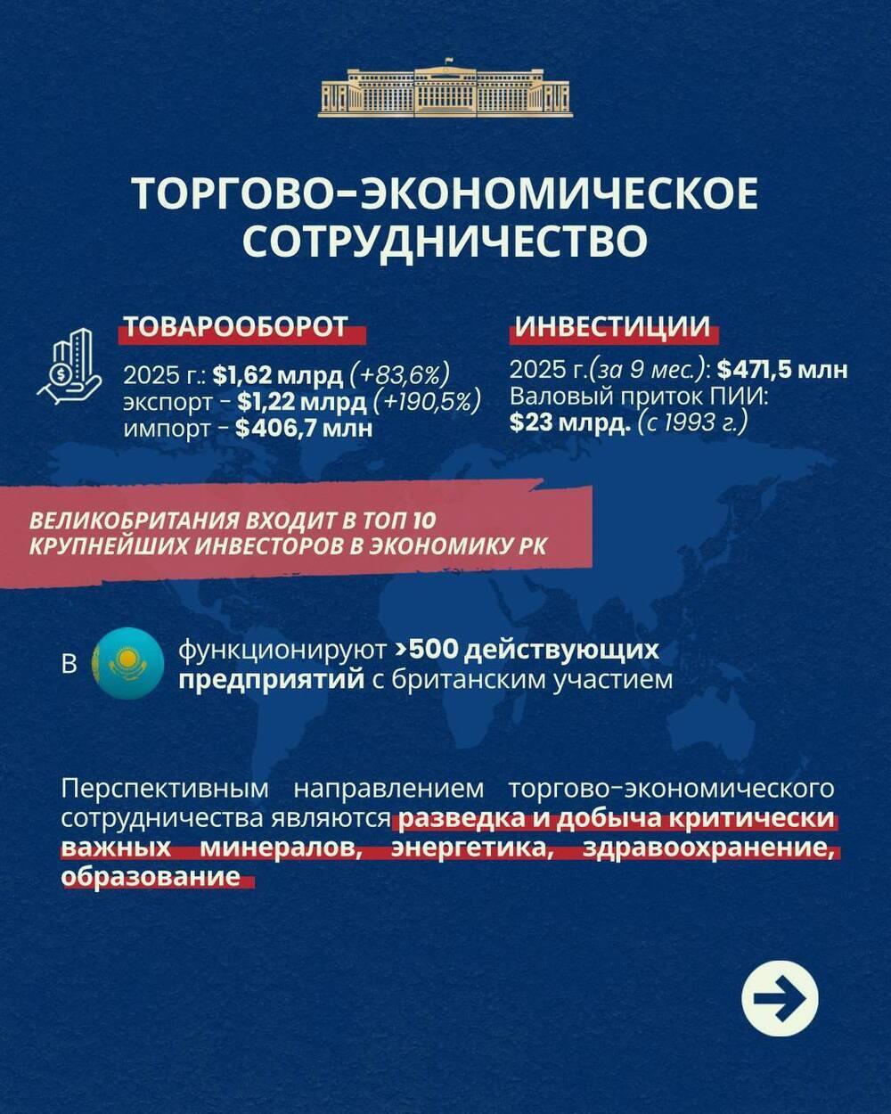 В 2025 году в Лондоне состоялось 8-е заседание казахстанско-британского стратегического диалога, а также 11-е заседание межправительственной комиссии по торгово-экономическому, научно-техническому и культурному сотрудничеству.