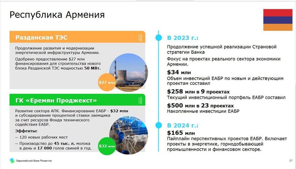 По словам Ильина, в Армении проекты ЕАБР реализуются давно и успешно. Объем инвестиций ЕАБР по новым и действующим проектам составил уже $34 млн.