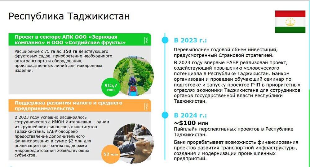 По словам спикера, в 2023 году ЕАБР впервые реализовал в Таджикистане проект, содействующий повышению человеческого потенциала в республике. Банк организовал и провел обучающий семинар по подготовке и запуску проектов ГЧП в приоритетных отраслях экономики Таджикистана для госсотрудников.