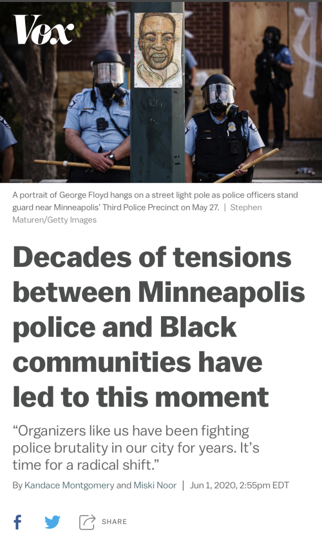 Скриншот: Vox: к смерти Флойда привела напряженность между полицией и общинами афроамериканцев в Миннеаполисе, продолжающаяся на протяжении десяток лет