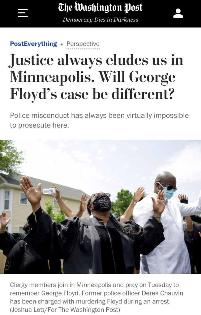 По сообщению газеты "Нью-Йорк таймс", доля "черных" в населении Миннеаполиса составляет меньше 20%, а доля случаев полицейского насилия в отношении них превышает 60% от общей статистики. Полиция Миннеаполиса уличена в общей сложности в 11,5 тыс. актах насилия. В их числе 6650 актов насилия были совершены в отношении афроамериканцев. В отношении представителей белой расы этот показатель составил лишь 2750.