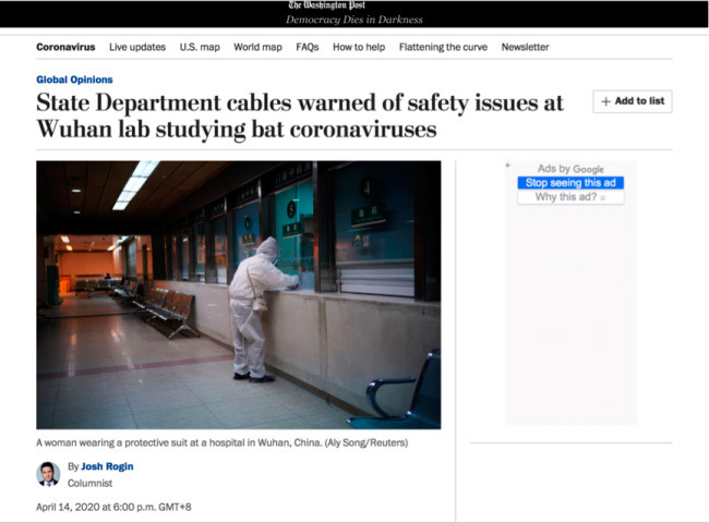 14 апреля газета "Вашингтон пост" опубликовала статью обозревателя Джоша Рогина под заголовком "Госдепартамент США предупреждает о проблемах безопасности в уханьской лаборатории, изучавшей коронавирусы летучих мышей".