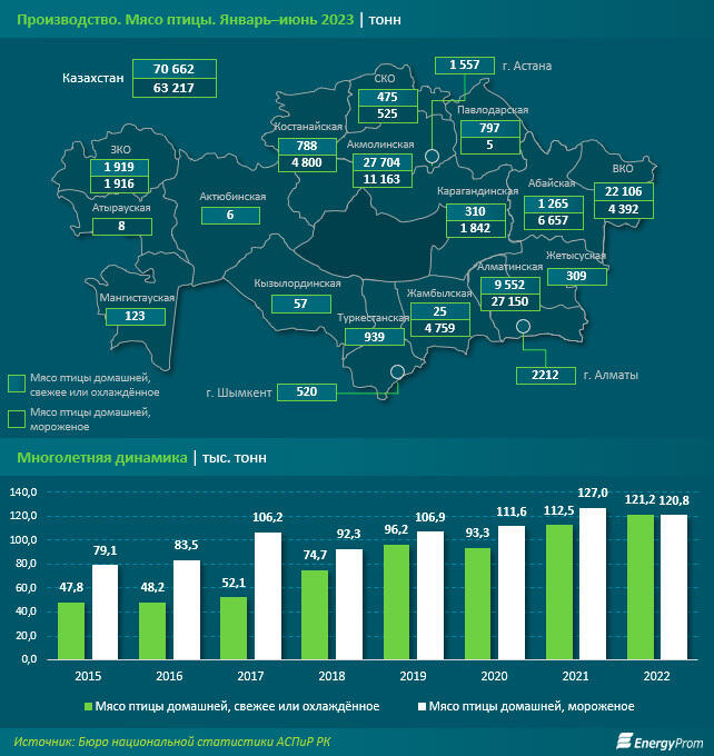 По производству мороженого мяса птицы лидирует Алматинская область: 27,2 тысячи тонн. На второй и третьей строчках расположились Акмолинская и Абайская области.