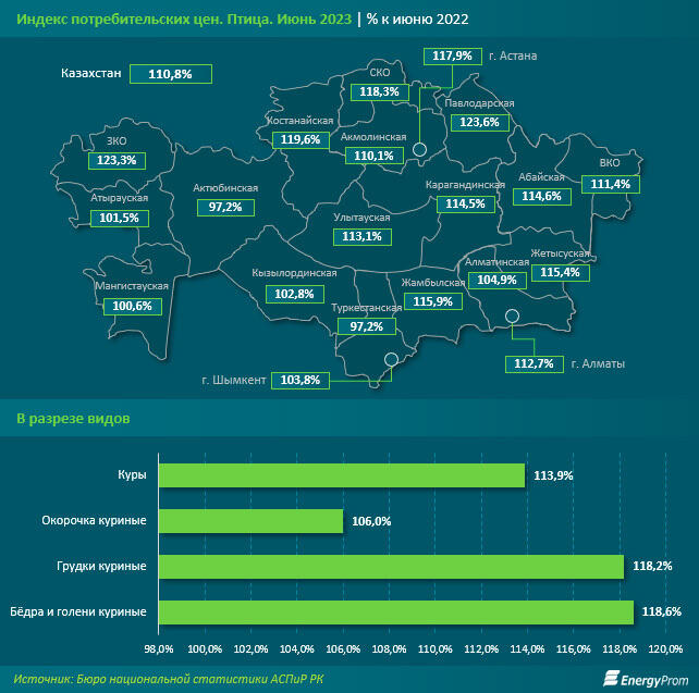 В региональном разрезе наибольший рост цен на птицу был зафиксирован в Павлодарской области: на 23,6%. В тройку регионов-антилидеров также вошли Западно-Казахстанская (плюс 23,3%) и Костанайская (плюс 19,6%) области.