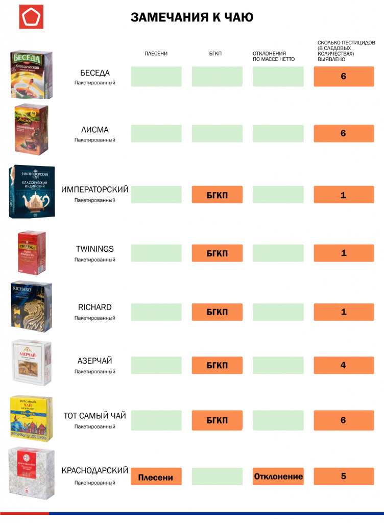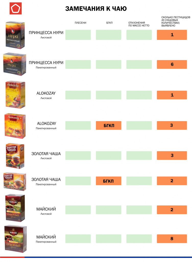 Замечания экспертов связаны в основном со следами пестицидов и наличием в некоторых чаях плесени и бактерий группы кишечной палочки (БГКП). В двух случаях из 48 выявлены нарушения по массе нетто.