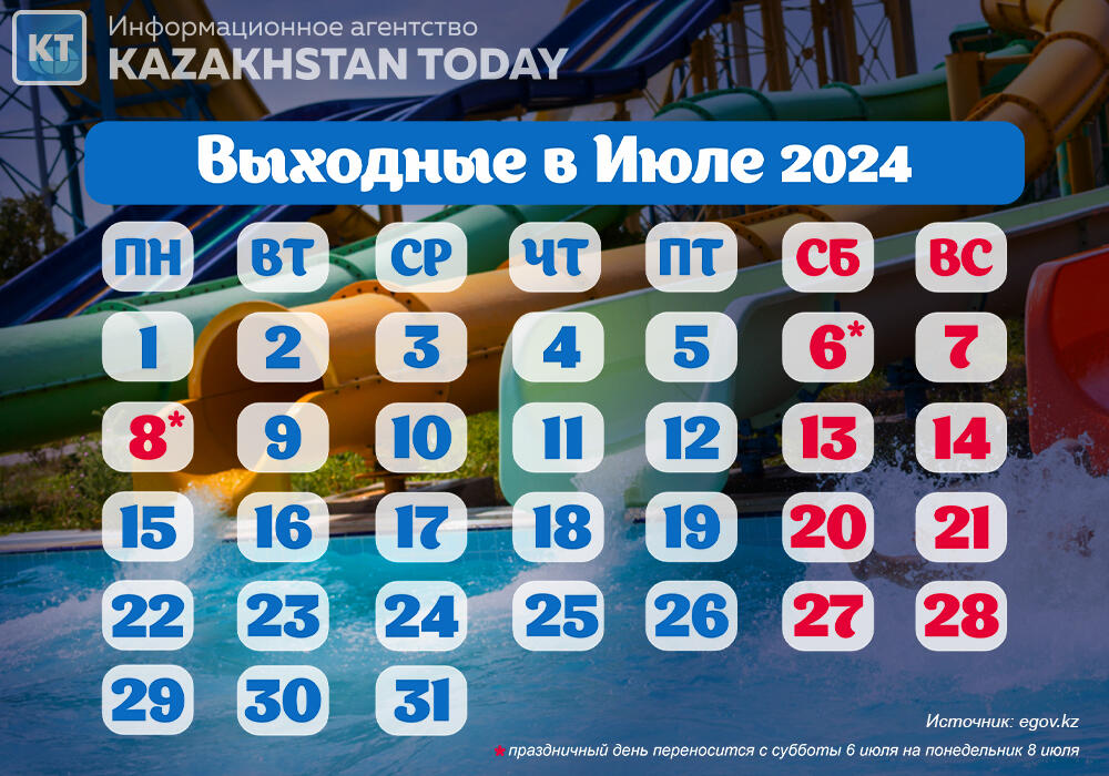 Всего в июле у казахстанцев, работающих пять дней в неделю, будет 22 рабочих и девять выходных дней.