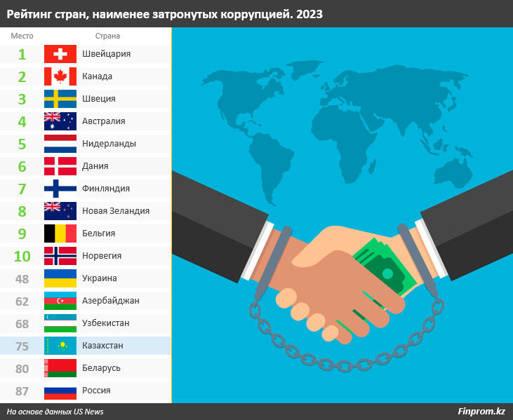 В рейтинге US News 2023 по наименее коррумпированным странам Казахстан оказался в конце списка - на 75-м месте среди 87 государств, сообщает finprom.kz.