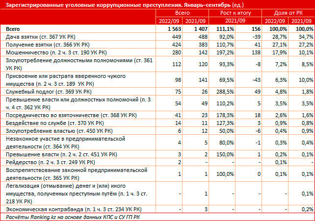 За январь-сентябрь 2022 года в стране зарегистрировали 1,6 тысячи уголовных коррупционных преступлений - на 11,1% больше, чем годом ранее, сообщает ranking.kz.