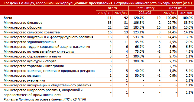 В число антилидеров также попали Министерство обороны РК (22 человека, плюс 83,3%), Министерство сельского хозяйства (16 человек, плюс 23,1% за год) и Министерство индустрии и инфраструктурного развития (также 16 человек, причем сразу в 5,3 раза больше, чем годом ранее).