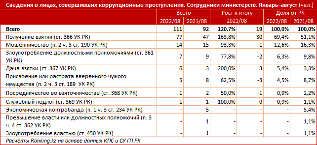 Чаще всего такие преступления совершали сотрудники Министерства финансов: 33 человека против 31 годом ранее. Годовой рост составил 6,5%.