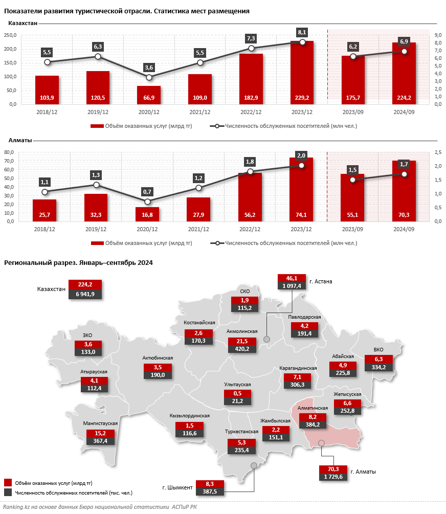 Напомним, туристическая сфера Казахстана переживает расцвет. Численность туристов - внутренних и иностранных - растет каждый год, а следом увеличиваются и финансовые показатели отрасли. По данным Бюро национальной статистики АСПиР РК, за январь-сентябрь текущего года гостиничный бизнес отчитался об оказании услуг на сумму около 224,2 млрд тенге. Это на 27,6% больше по сравнению с девятью месяцами 2023-го и фактически приравнивается к объему оказанных услуг за весь прошлый год, отмечает ranking.kz.