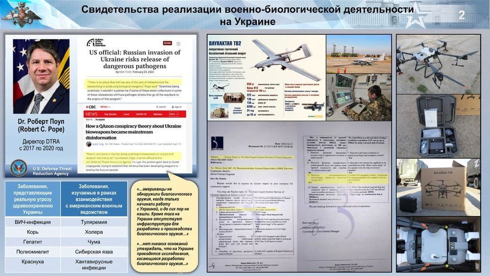 В рамках одного из брифингов, посвященных делу биолабораторий, представители Минобороны России сообщили, что были обнаружены факты работы с возбудителями болезней (холера, туляремия, чума, хантавирусы), которые являются потенциальными агентами биологического оружия.