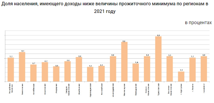 По данным бюро, сохранилась значительная дифференциация доходов между горожанами и сельчанами. В городской местности доля населения с доходами ниже величины прожиточного минимума составила 3,8%, а в сельской местности - 7,2%. Наибольшая разница между уровнем городской и сельской бедности в 2021 году наблюдалась в Атырауской (9,1 раза) и Мангистауской (4,3 раза) областях.