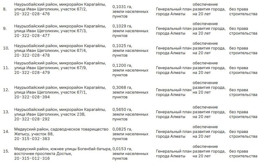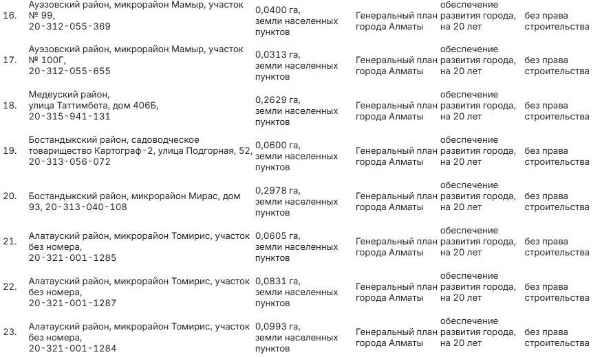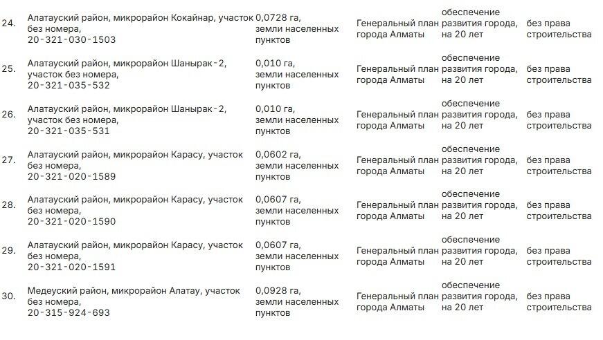 Согласно приложению, резервированию подлежат 30 земельных участков в разных районах Алматы.