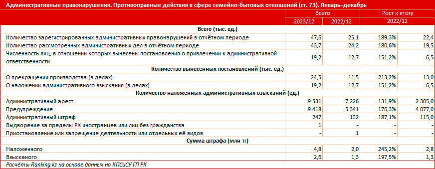 Из рассмотренных дел в семейно-бытовой сфере прекратили 24,5 тысячи, это в 2,1 раза больше, чем в 2022 году. По остальным 19,2 тысячи дел были наложены административные взыскания. Из них 9,5 тысячи закончились административным арестом, 9,4 тысячи - предупреждением, 247 - административным штрафом, одно - выдворением за пределы РК (работает для иностранцев или лиц без гражданства).