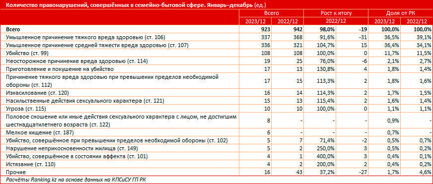 Среди распространенных уголовных правонарушений в семейно-бытовой сфере также оказались: убийства (108 случаев), неосторожное причинение вреда здоровью (19 случаев), приготовление и покушение на убийство и причинение тяжкого вреда здоровью при превышении пределов необходимой обороны (по 17 случаев на каждую из статей).