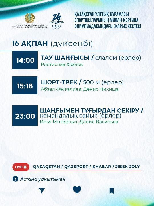 Милан. 16 февраля. KAZAKHSTAN TODAY - Казахстанцы выступят в трех видах спорта 16 февраля на Олимпийских играх в Италии, сообщили в Минтуризма и спорта РК.