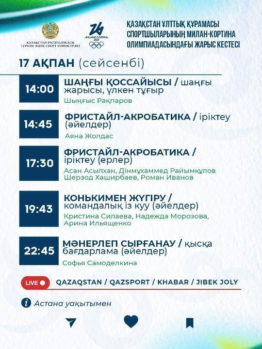 Милан. 17 февраля. KAZAKHSTAN TODAY - Во вторник, 17 февраля, казахстанские спортсмены выступят в четырех видах спорта на Олимпийских играх-2026, сообщили в Минтуризма и спорта РК.
