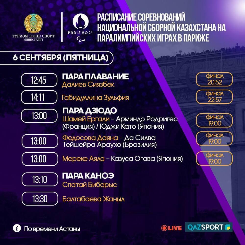 Париж. 6 сентября. KAZAKHSTAN TODAY - По итогам восьмого дня Паралимпиады сборная Казахстана имеет две золотые, две серебряные и одну бронзовую медали. Об этом сообщили в пресс-службе Министерства туризма и спорта РК.