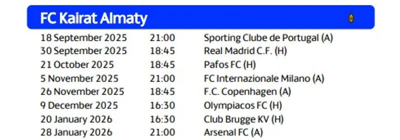 Для королевского клуба это будет первый в истории визит в Казахстан. Помимо "Реала" подопечные Рафаэля Уразбахтина сыграют в Лиге Чемпионов дома с "Брюгге", "Пафосом" и "Олимпиакосом", а на выезде - с лондонским "Арсеналом", "Интером" из Милана и "Копенгагеном", - сообщает Sports.kz.