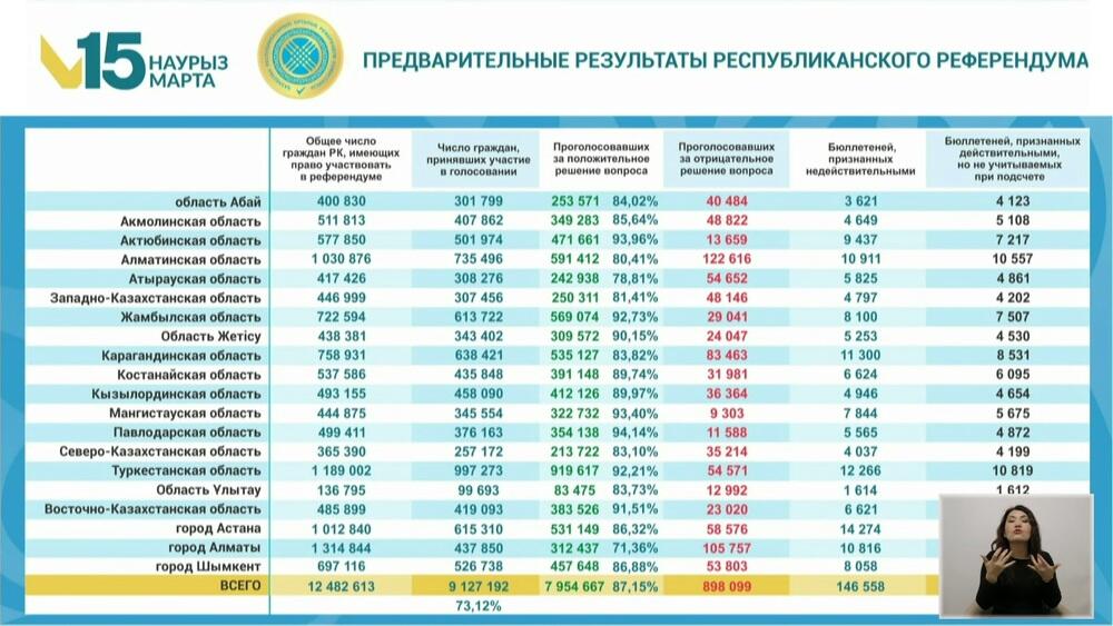 Напомним, 15 марта в Казахстане состоялся республиканский референдум по новой Конституции. В списки граждан, имеющих право на участие в референдуме, были включены 12 461 796 человек.