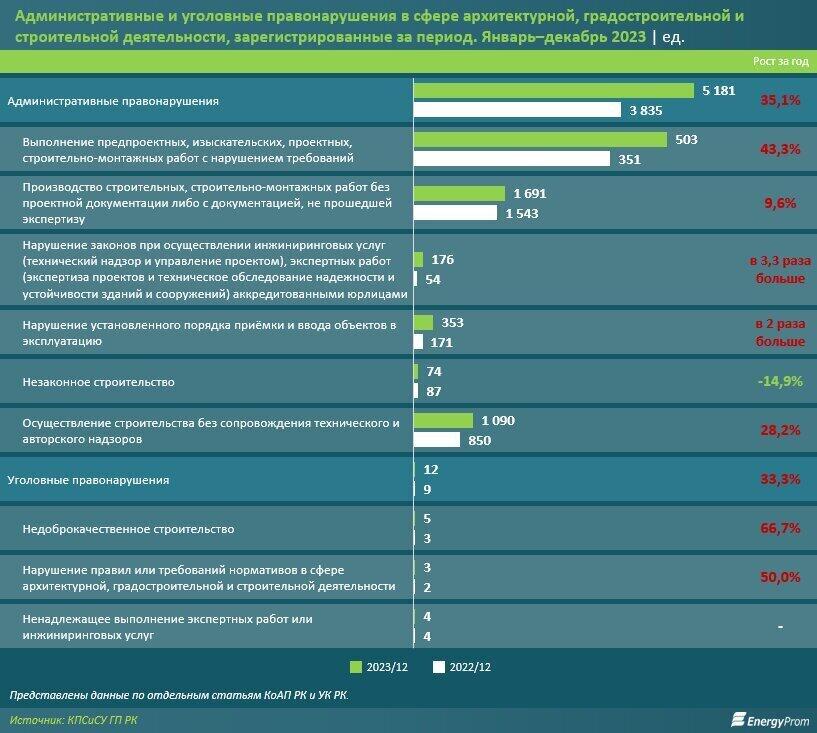 За прошедший год количество административных правонарушений в строительной сфере в РК выросло на 35,1%. Судя по данным Комитета по правовой статистике и специальным учетам Генеральной прокуратуры РК, за январь-декабрь 2023 года было зарегистрировано 5,2 тыс. таких административных дел.