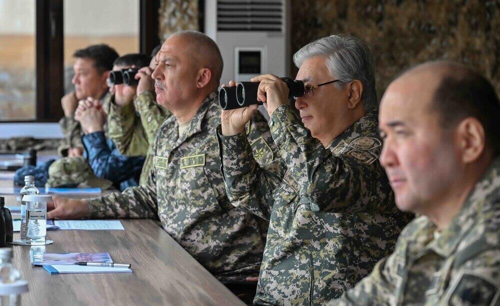 Касым-Жомарт Токаев наблюдал за ходом учения со смотровой вышки. Перед началом вооруженных маневров генерал-майоры Болат Журабаев и Алмаз Джумакеев доложили главе государства о применении сил специальных операций и десантно-штурмовых войск в оборонительной операции.