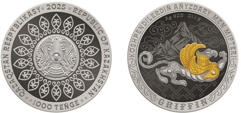 На монете GRIFFIN изображен грифон, парящий над стилизованными под национальный орнамент горами. На заднем плане в трафаретной технике выполнены вершины гор.