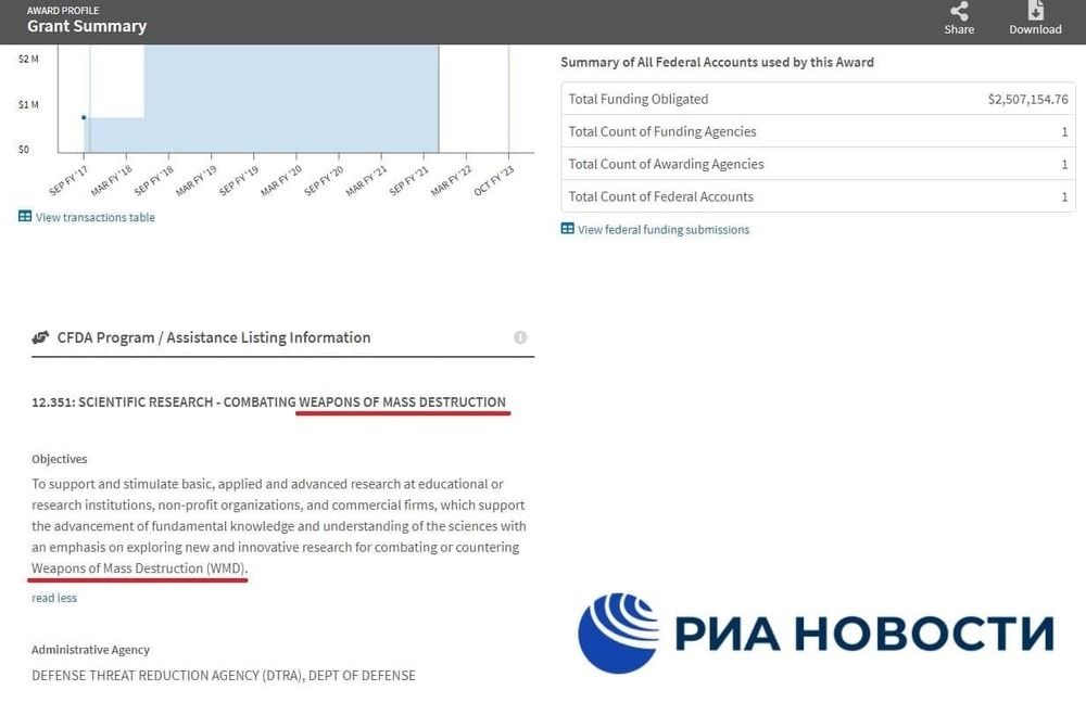 По данным издания, общая сумма финансирования этих исследований правительства США согласно документам составляет около 10,2 млн долларов: из них $6,5 млн - в Грузии, Армении, Азербайджане, Турции и Иордании и $3,7 млн - в Китае.